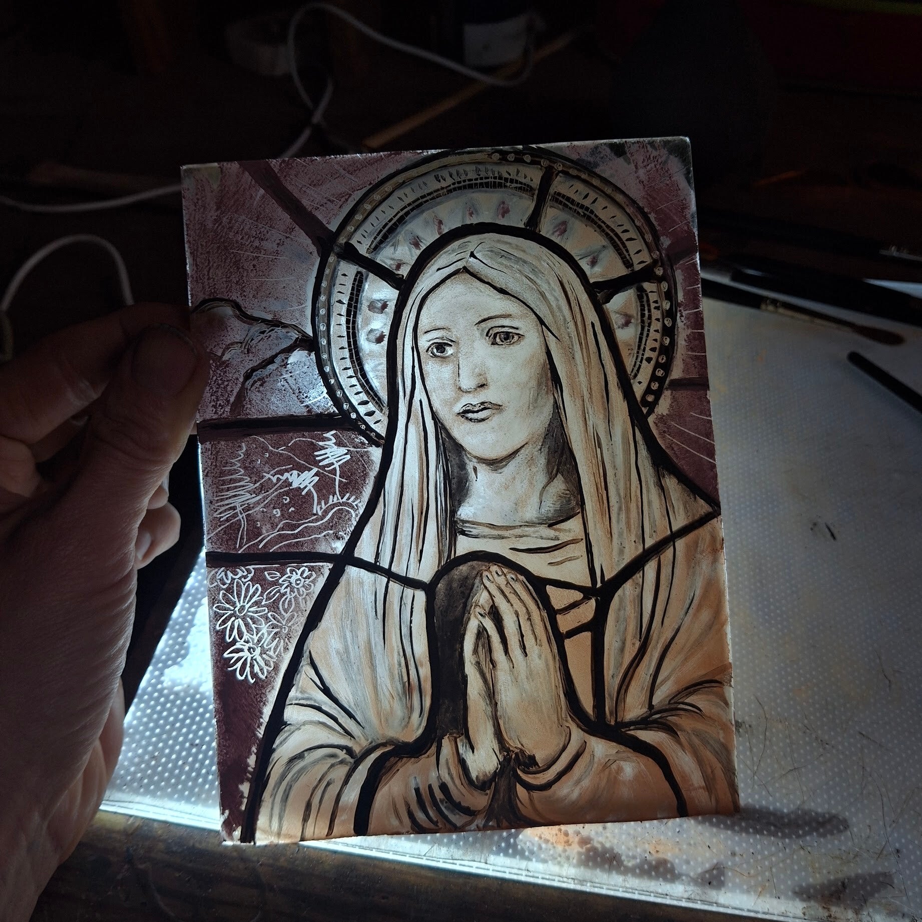 Bring peace and a glimpse of light to your prayer or meditation space. Choose from available patterns and enjoy a soft glow of a candle behind a picture. Framed in lead, painted with traditional glass paints, based on a wooden stand.