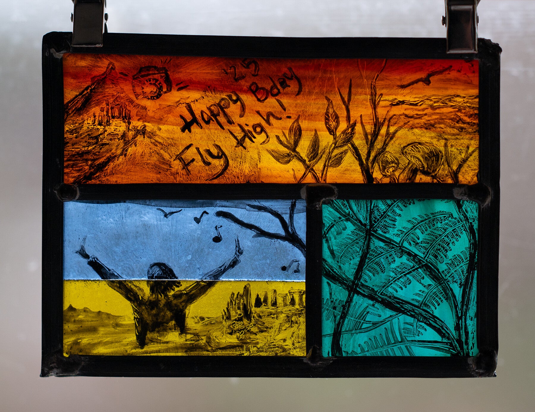 I will create a simple sketch with colours and send it to you. If you approve, I will create a stained glass card, pack it in a soft padded envelope and send it to you asap.